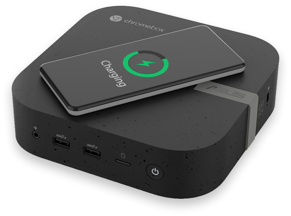 For added convenience, ASUS Chromebox 5 has a built-in WPC-certified Qi wireless charger that provides up to 15-watt output. Plus, a Foreign Object Detection (FOD) feature ensures the charger only works when a compatible device is detected, preventing overheating or damage to a non-compatible device.