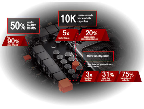 ROG’s revered digital power controller now delivers even-finer power, with Texas Instruments NexFET™ MOSFETs, MicroFine alloy chokes, Digi+ PWM controller and 10K black metallic capacitors — ensuring Extreme Engine Digi+ always delivers the smoothest core voltages!