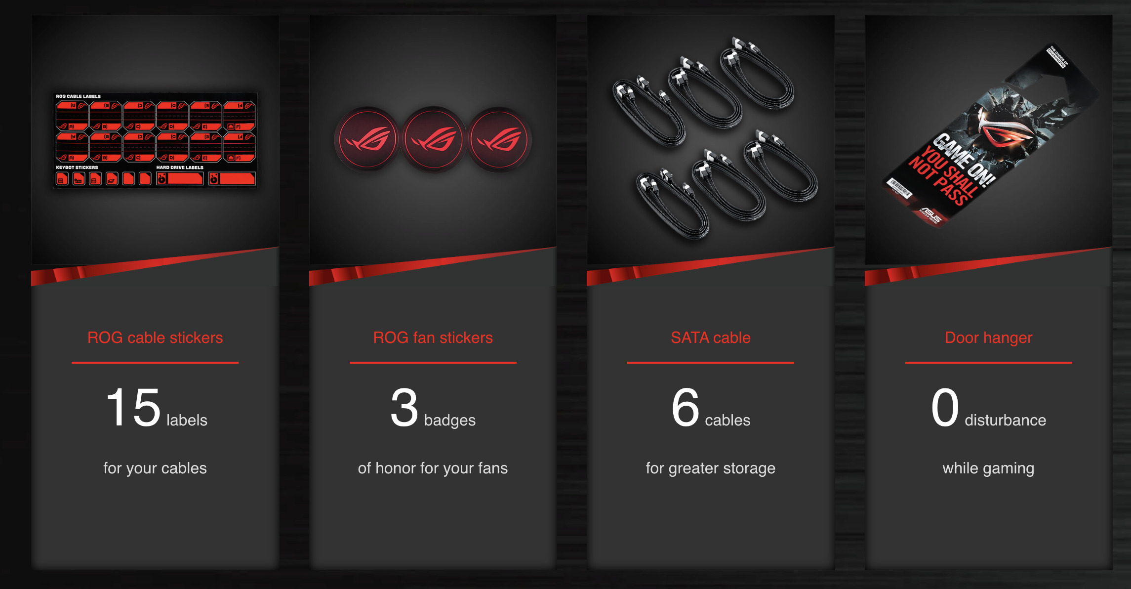 | Accessories | 1 x 12 in 1 ROG Cable Label(s) ROG Fan Label 1 x SLI bridge(s) 1 x ROG Door Hanger(s) 1 x Q-connector(s) (1 in 1) ASUS Q-Shield 1 x CPU installation tool 6 x SATA 6Gb/s cable(s) User’s manual 1 x M.2 Screw Package 1 x Supporting DVD |