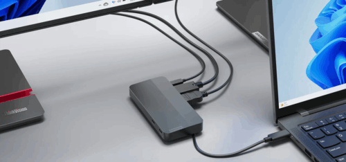 Compact and portable, the Lenovo USB-C Dual Display Travel Dock slips easily into your pocket and features adjustable built-in cable management, making it the ideal on-the-go productivity tool.