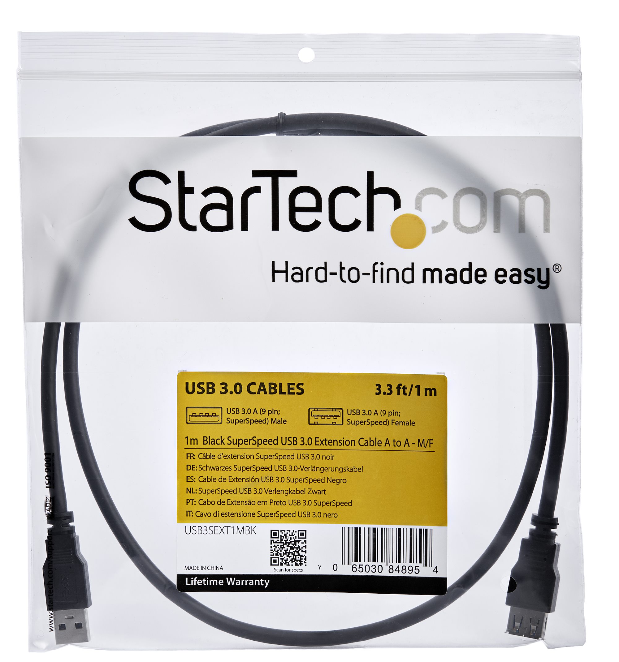 The USB3SEXT1MBK Black SuperSpeed USB 3.2 Gen 1 extension cable (1m, A-A), offers a durable, high quality connection that harnesses the full capability of the USB 3.2 Gen 1 standard.Designed for next-generation SuperSpeed USB device connections, this USB 3.2 Gen 1 male to female cable extends a USB 3.2 Gen 1 cable connection by up to 1 meter and delivers the full USB 3.2 Gen 1 bandwidth of 5Gbps, supporting maximum throughput between compatible devices when used with a USB 3.2 Gen 1 host and device.Our USB 3.2 Gen 1 extension cord features high quality Shielded Twisted Pair (STP) construction, helping to prevent electromagnetic interference and ensuring reliable data communication.The USB3SEXT1MBK is backed by our Lifetime Warranty, providing guaranteed quality and reliability.