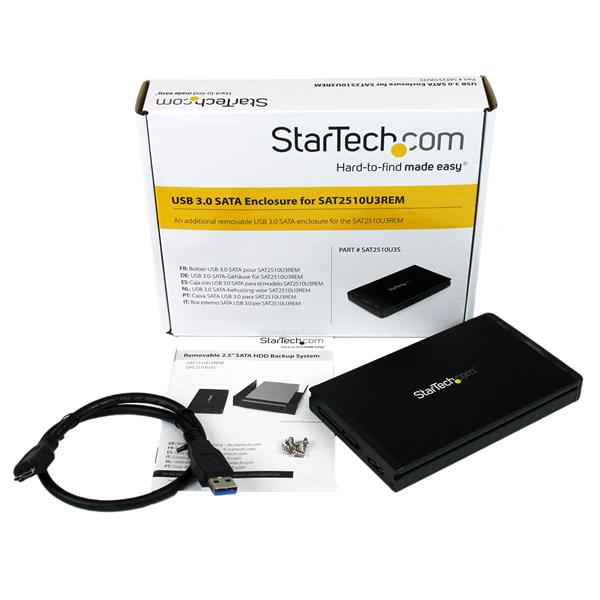 The SAT2510U3S 2.5in Hard Disk Drive Enclosure for SAT2510U3REM is a spare SATA drive enclosure for use with the SAT2510U3REM Removable Hard Drive Backup System/Mobile Rack, which simplifies removing/rotating drives, and is also backward compatible with the USB 2.0 model, SAT2510U2REM.